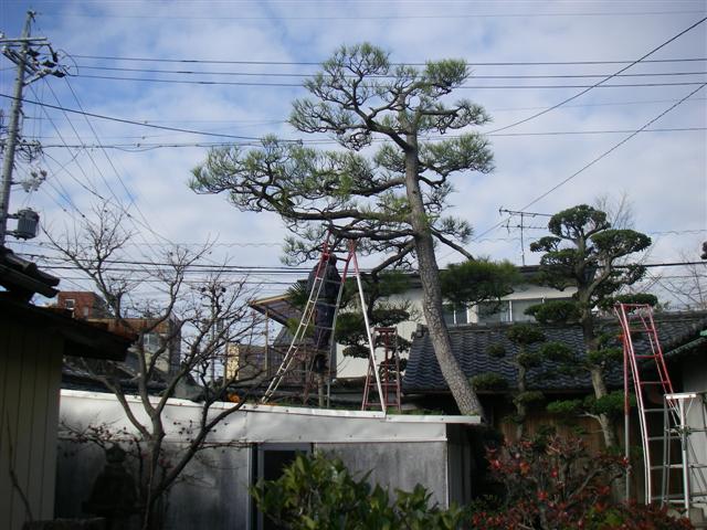 車庫の上に松が伸びていて、車庫にコンパネを敷き脚立を立てて松の剪定をしています。