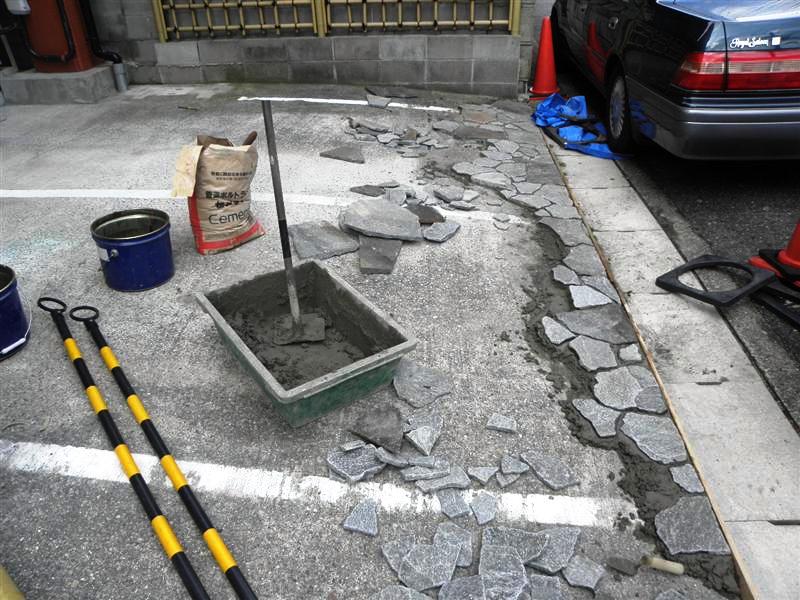 砂利が散らばらないように段差を付け鉄平石を張り、奥の方は白川砂利を設置します。