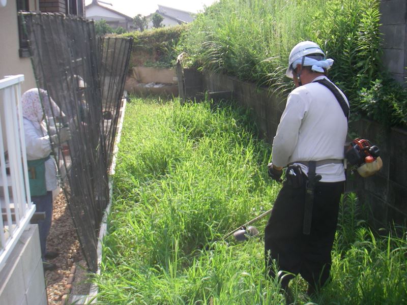 石等が飛んで、窓ガラス等を傷つけないように防護ネットを使って作業をしています。