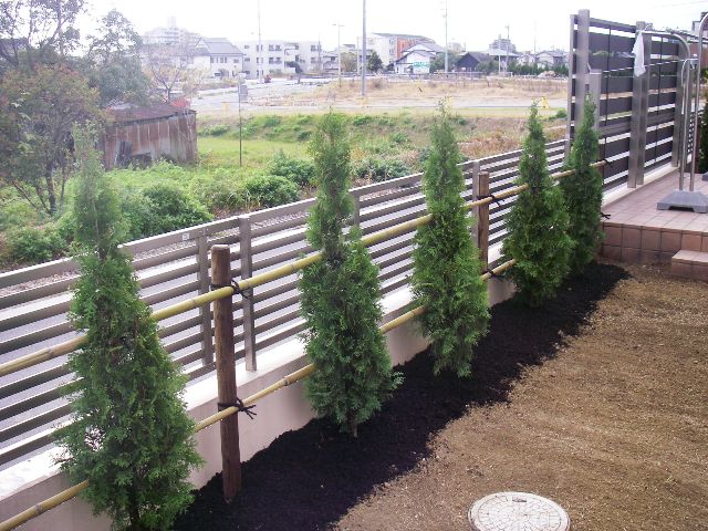 コニファー(針葉樹)「グリーンコーン」と低木「ボックスウッド」を植えました。