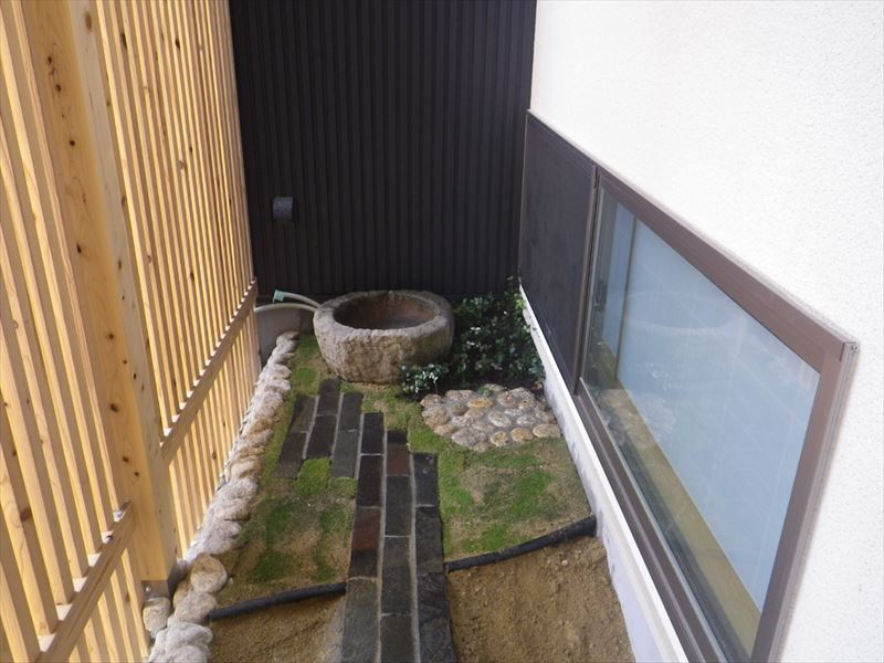 つくばいの横にハツユキカズラ コウライシバ 手前に砂利を入れる予定です。
