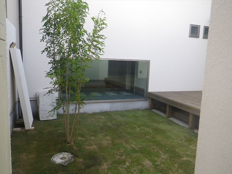 中庭にはコウライシバとシマトネリコを植栽させていただきました。
