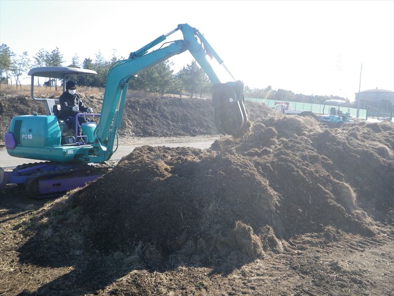 芝生だけだとなかなか堆肥にならないので、完熟した堆肥を混ぜて再発酵させます。