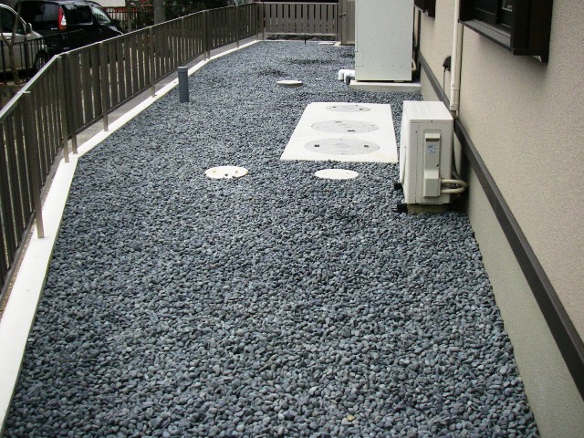 草生えの予防に防草シートを下に引き込んでいます。
