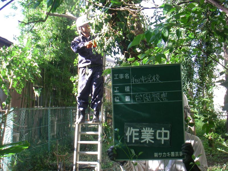 中学校の敷地内のナンキンハゼが台風により枝が折れて垂れ下がっています。
