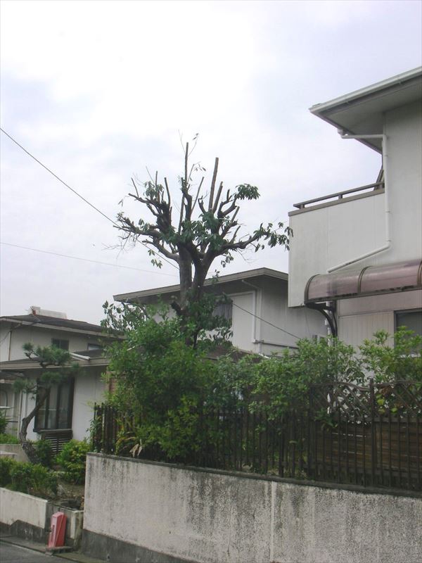 隣の家の雨どいに落ち葉が詰まるので、民家寄りのクスノキは伐採しました。