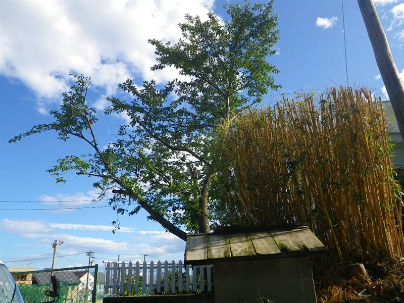 サクラは越境と屋根の上に覆いかぶさっていたので、間引きをしました。