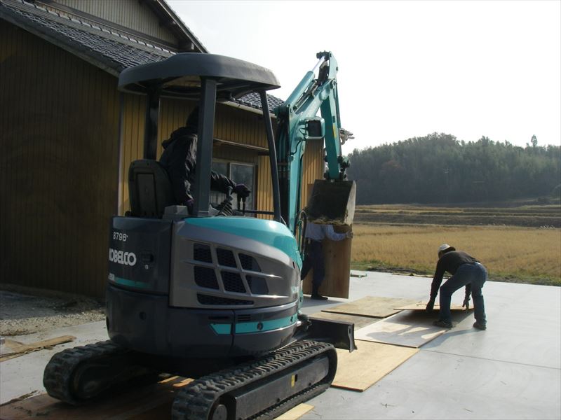 クレーン車が使えず、バックホウにて移動です。