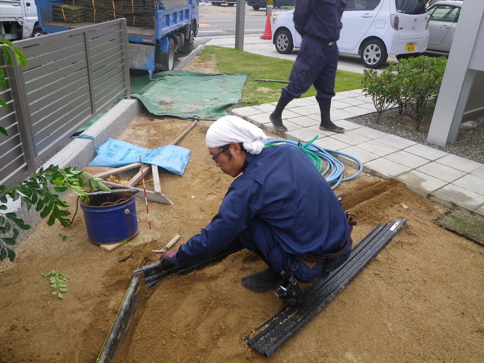 施工前に除草剤を散布して、排水が悪かったので土を入れ替えました。