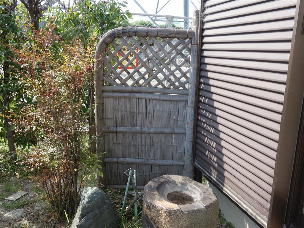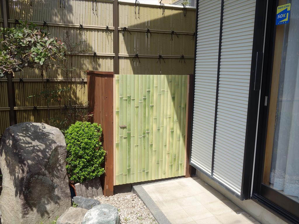 間仕切りのラティスフェンスが古くなり、仕切りにならなくなりましたので、人工竹の御簾垣を設置しました。