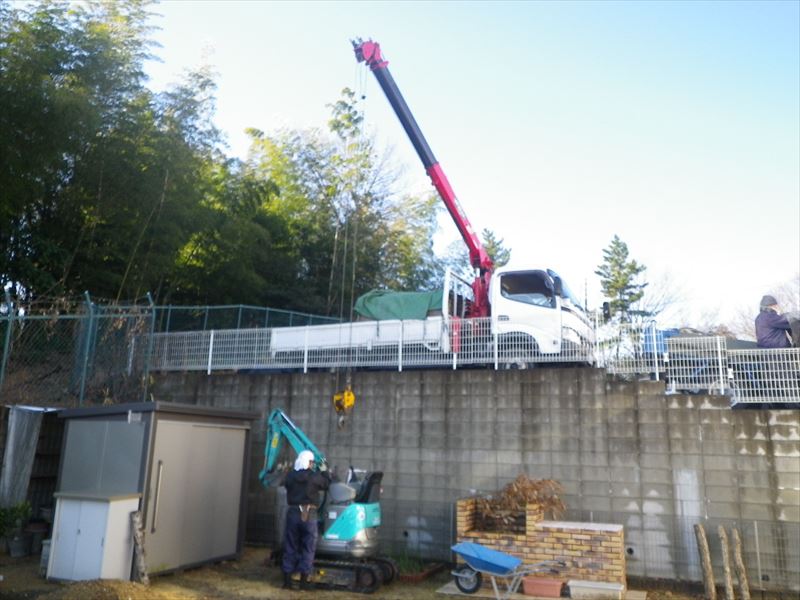 高さ3mほどの隣地より、重機及び土の搬出等を行ないました。