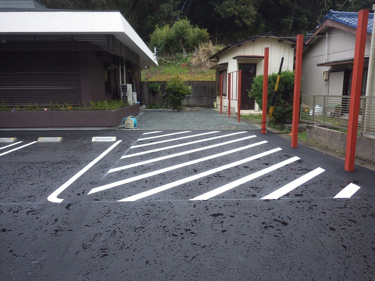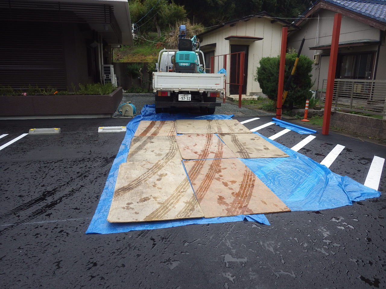 前日に舗装したばかりのためキズや汚れをつけないよう養生してからの作業となりました。