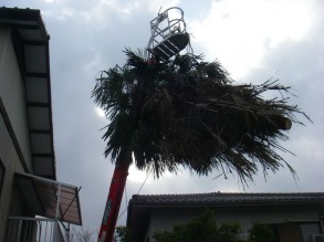 シュロの木を切る時に家に倒れて傷付かないようにクレーン車で吊って作業します。