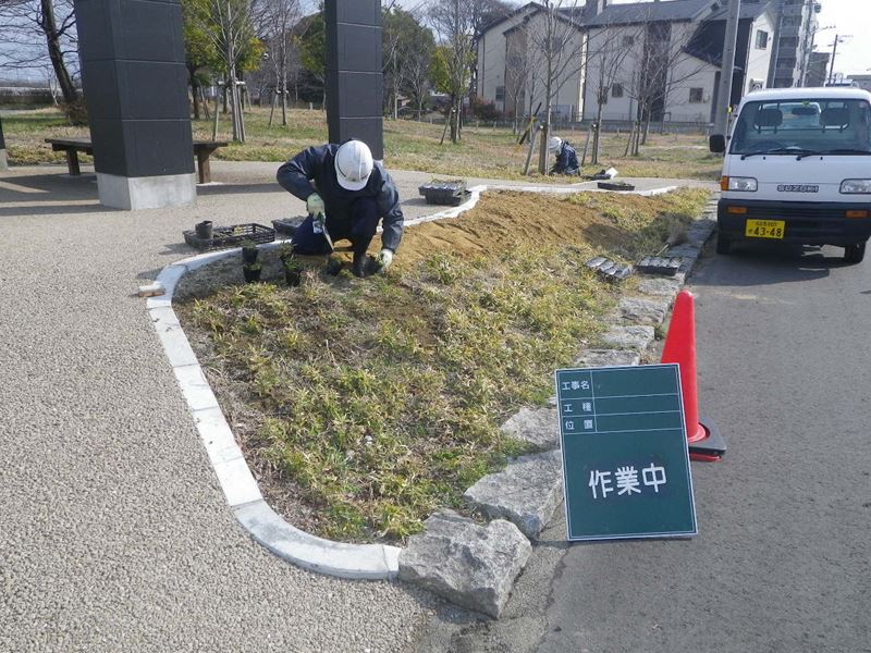 コグマザサをうえています。下が固く掘るのに大変でした。しっかり水をあげました。