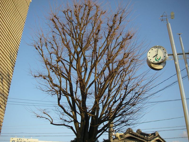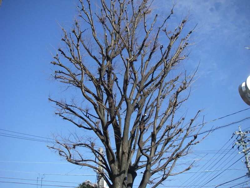 ケヤキ(欅)は電柱ほど伸びているのでクレーン車で剪定しました。