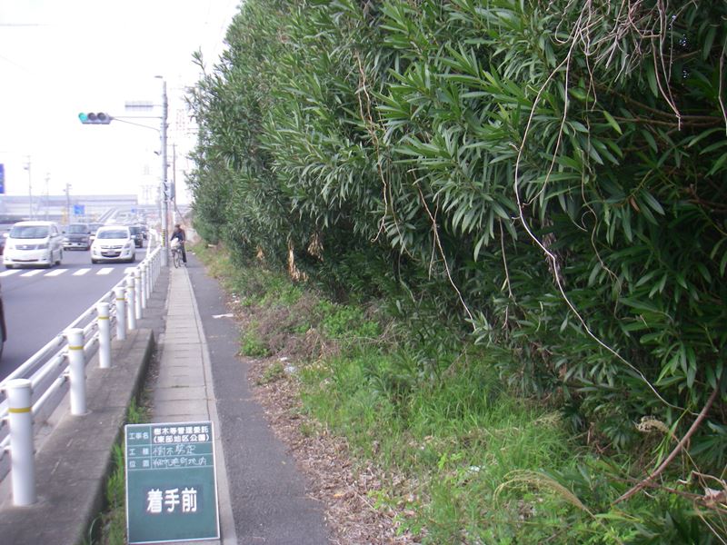 キョウチクトウが大きくなって歩道に伸びてきてしまったので、剪定を行いました。