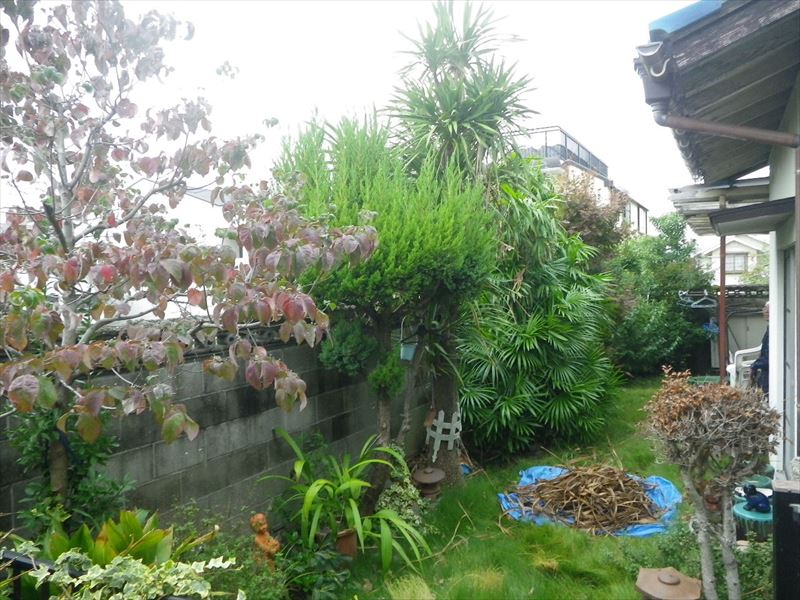 カイズカイブキは伐採、低木 ヒラドツツジ・キンメツゲはブロックや庭園灯が見えるように強剪定をしました。