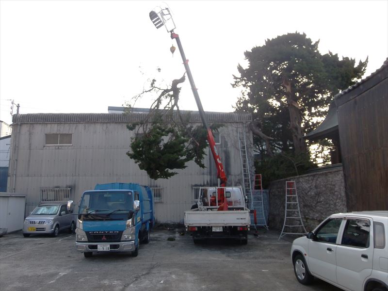 チェーンソーで強剪定を行い、剪定枝をゴミ収集車にて片づけましたので、早く終了しました。