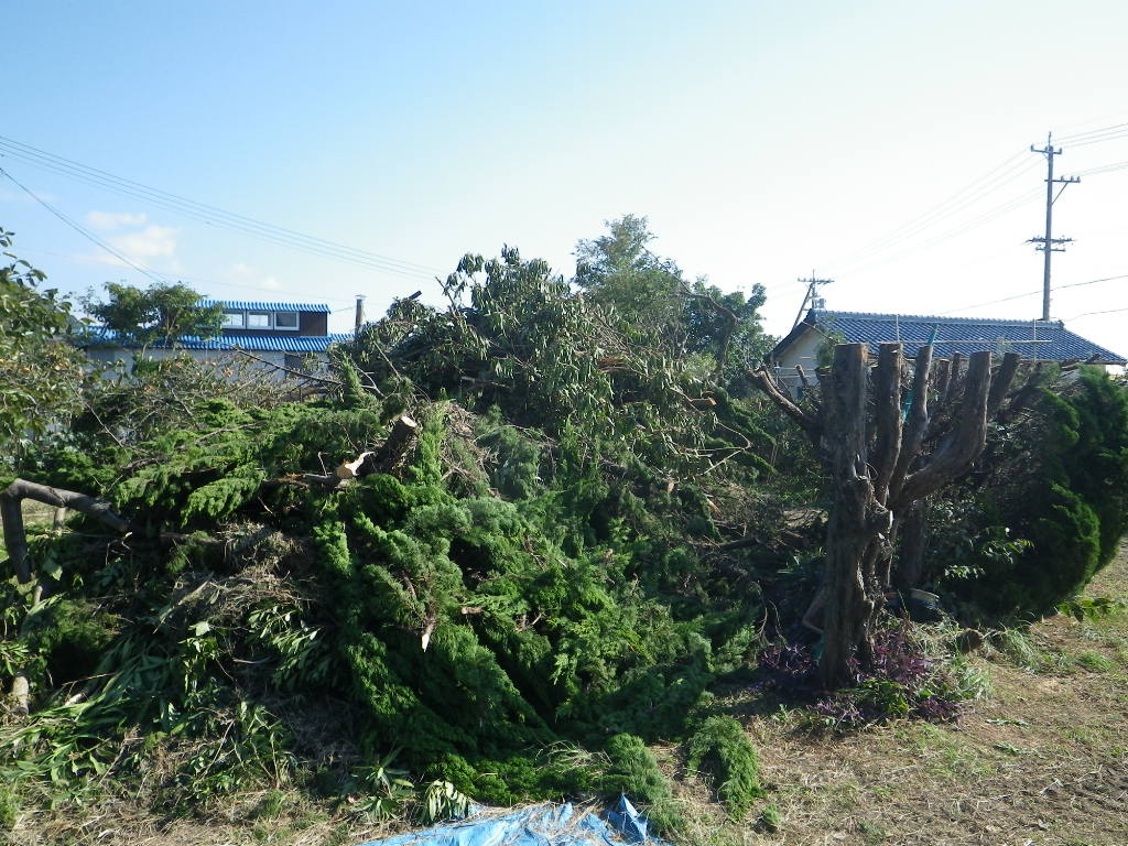背景に紛れて分かりにくいですが、山積みの剪定ゴミです。