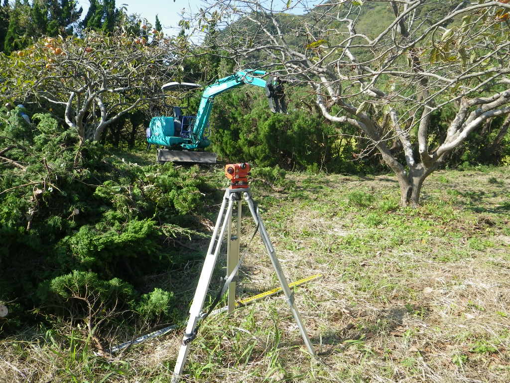 生垣の水平を調べる「レベル」という機器です。(手前の三脚の機器)