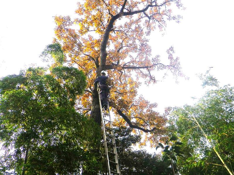クレーン車などの重機が入らず、下に剪定下枝を落とせないので難しい作業です。