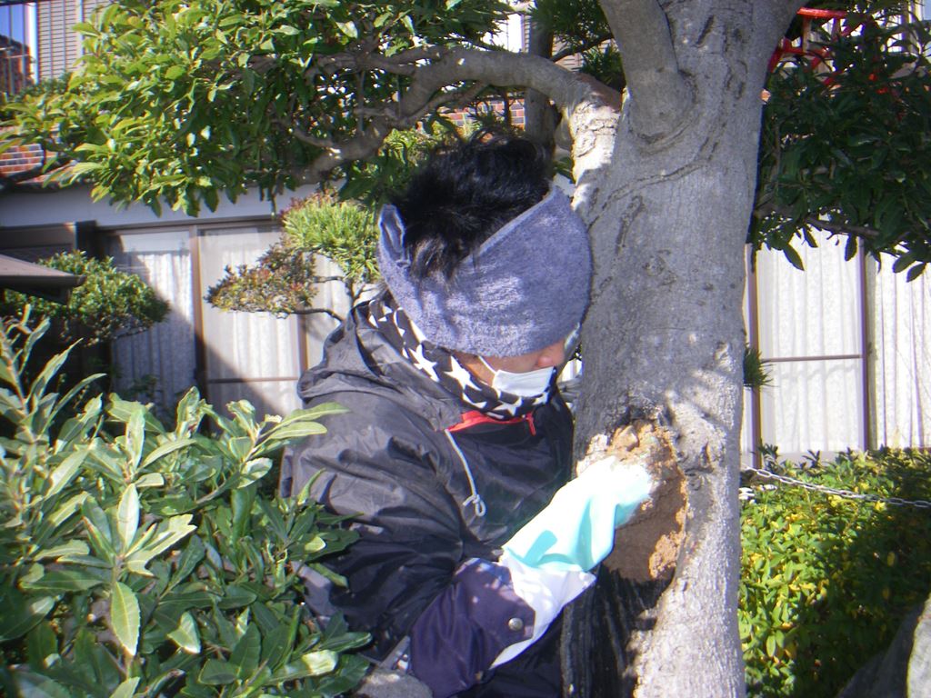幹に腐りが入ってしまった老木にウッディードクターを使用し補修を行いました。