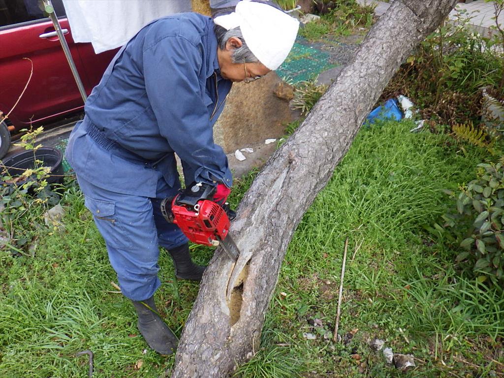 大きな部分はチェーンソーで切り取ります。