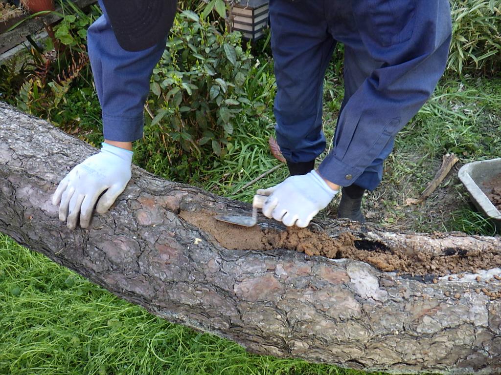 作ったウッディードクターを木の腐った所に詰めています。直角の所はちょっと硬めに練ると