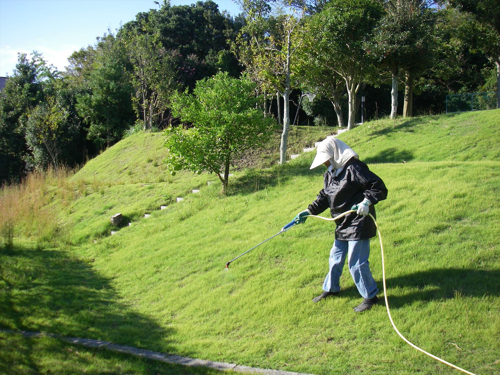 除草剤散布時、樹木や洗濯物、歩行者に気を付けてムラがないように散布します。