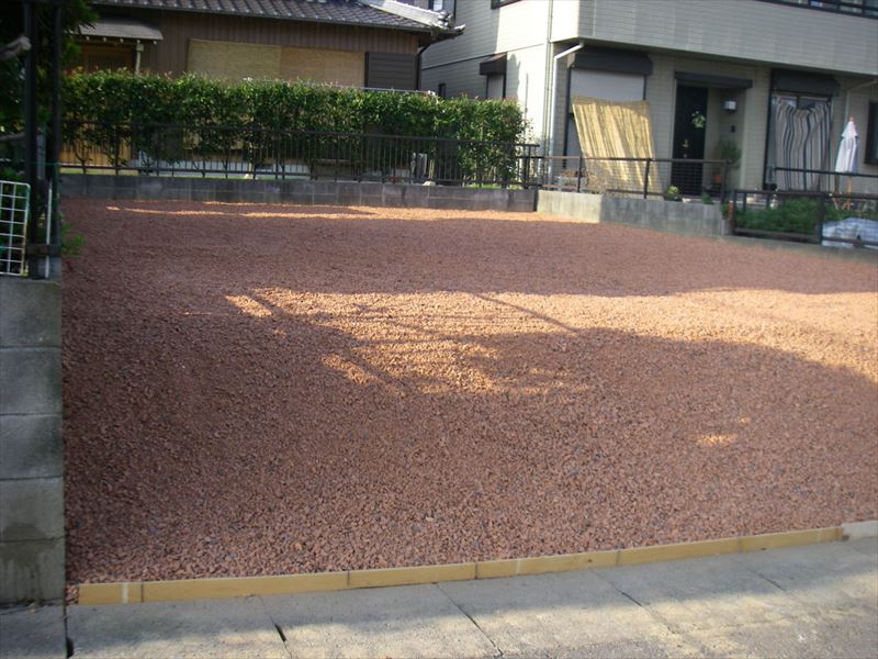 完了写真です。 防草シート(ザバーン240強力タイプ)を敷き、砂利シャモット(瓦の砕いたもの)を設置しました。
