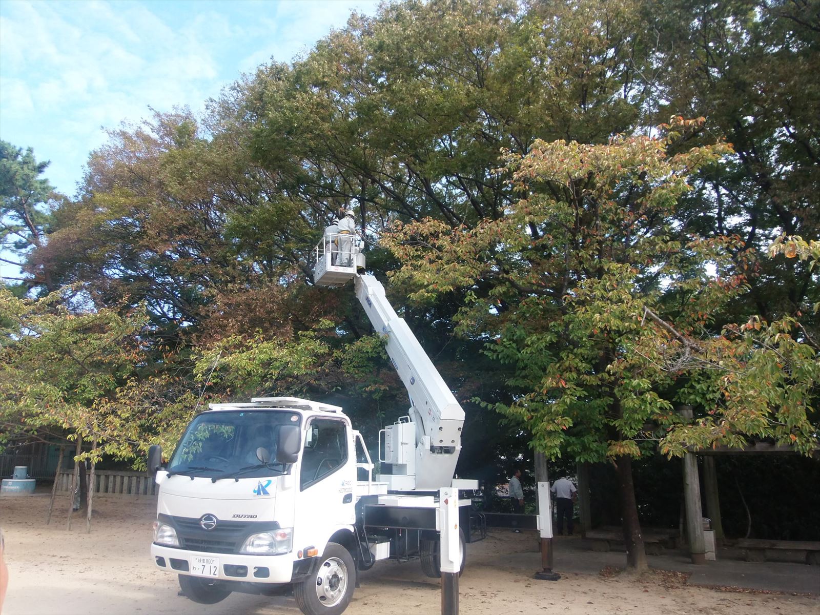 高所作業車を使い、高木を剪定しています。