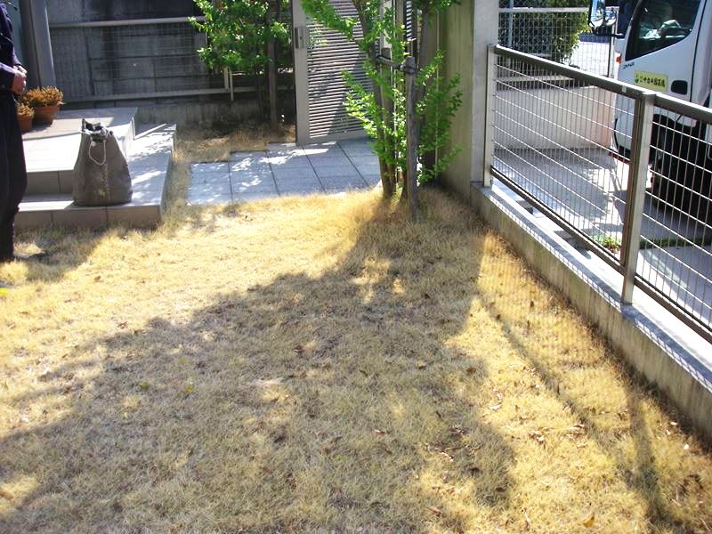 デッキの前あたりの芝が、茶色になってきています。この部分の張りかえを行います。