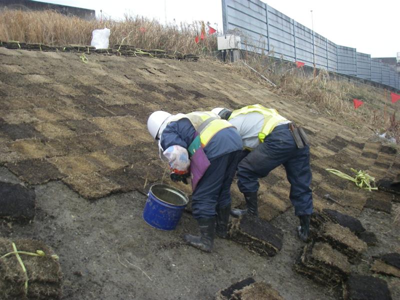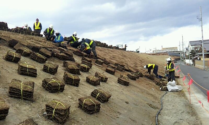 名古屋市中川区にて法面の復旧でノシバを張ってます。