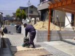 転圧し川砂で調整した後、透水性のインターロッキングを引き詰めます。