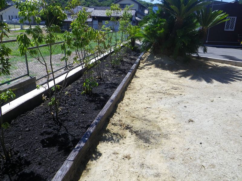 既存の土とバークマルチ材を混入して、表土にもマルチングを行っています。