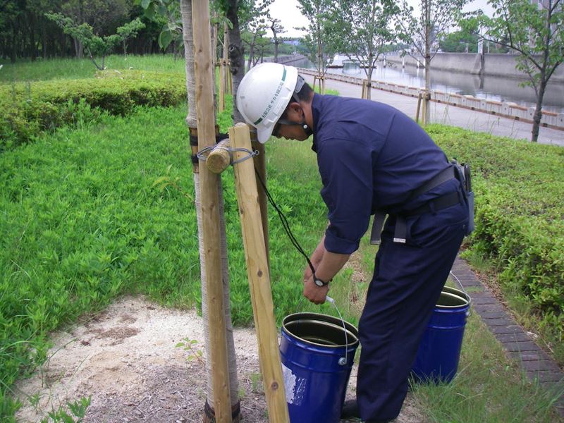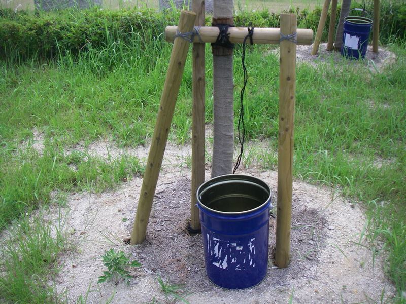 公園で植栽樹木に水かけのバケツを取り付けています。
