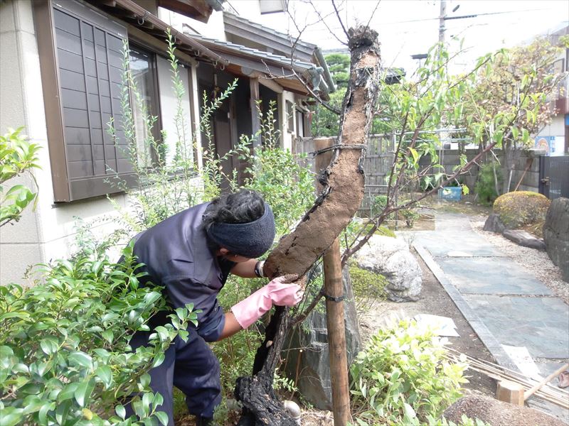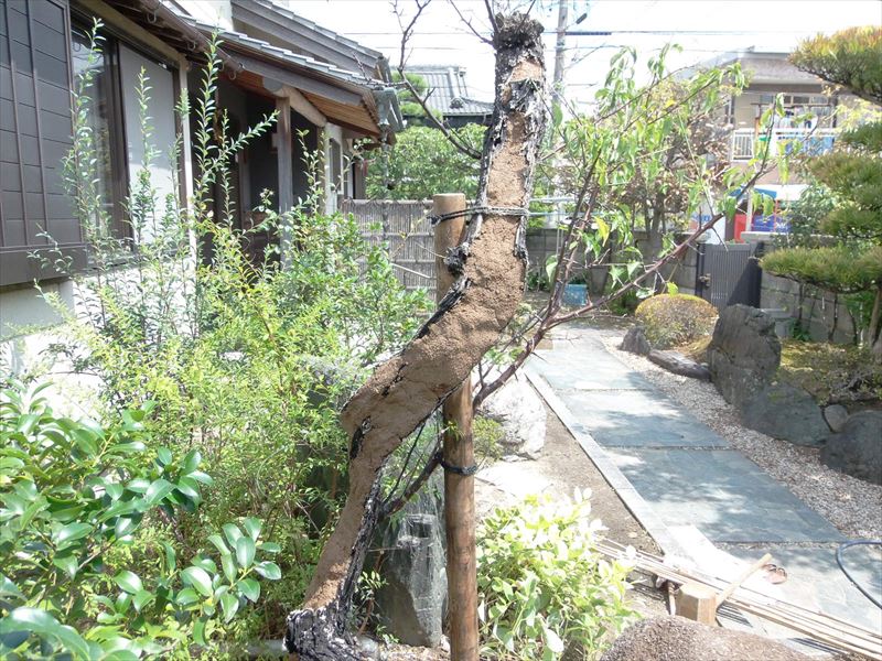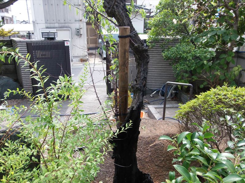 樹木の水分の需要とバランスを保つため、葉を少なくするように剪定をして樹木補修 完了です。