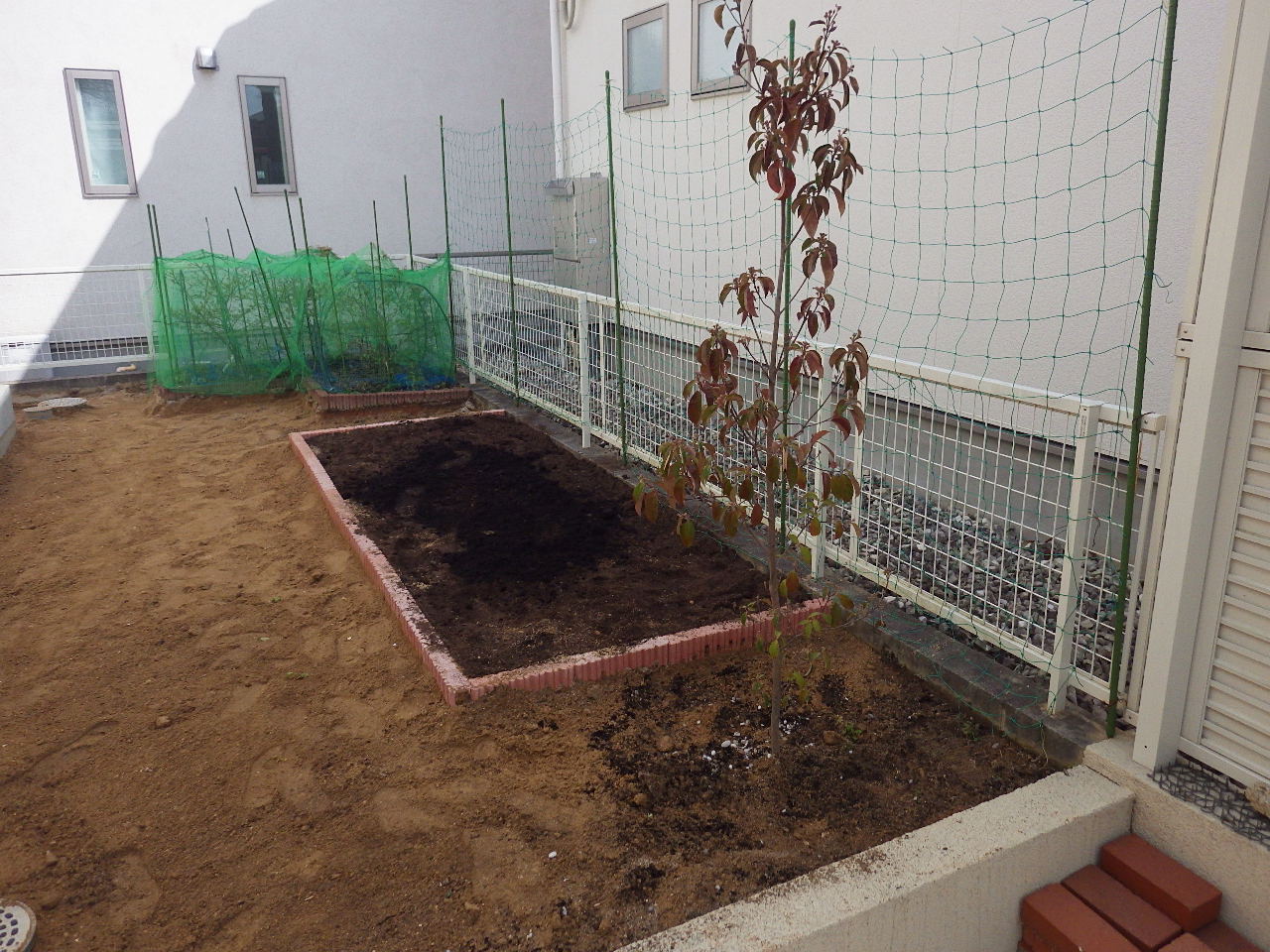 レンガブロックを地面に半分ほど埋め倒れないようにし、畑土を入れました。