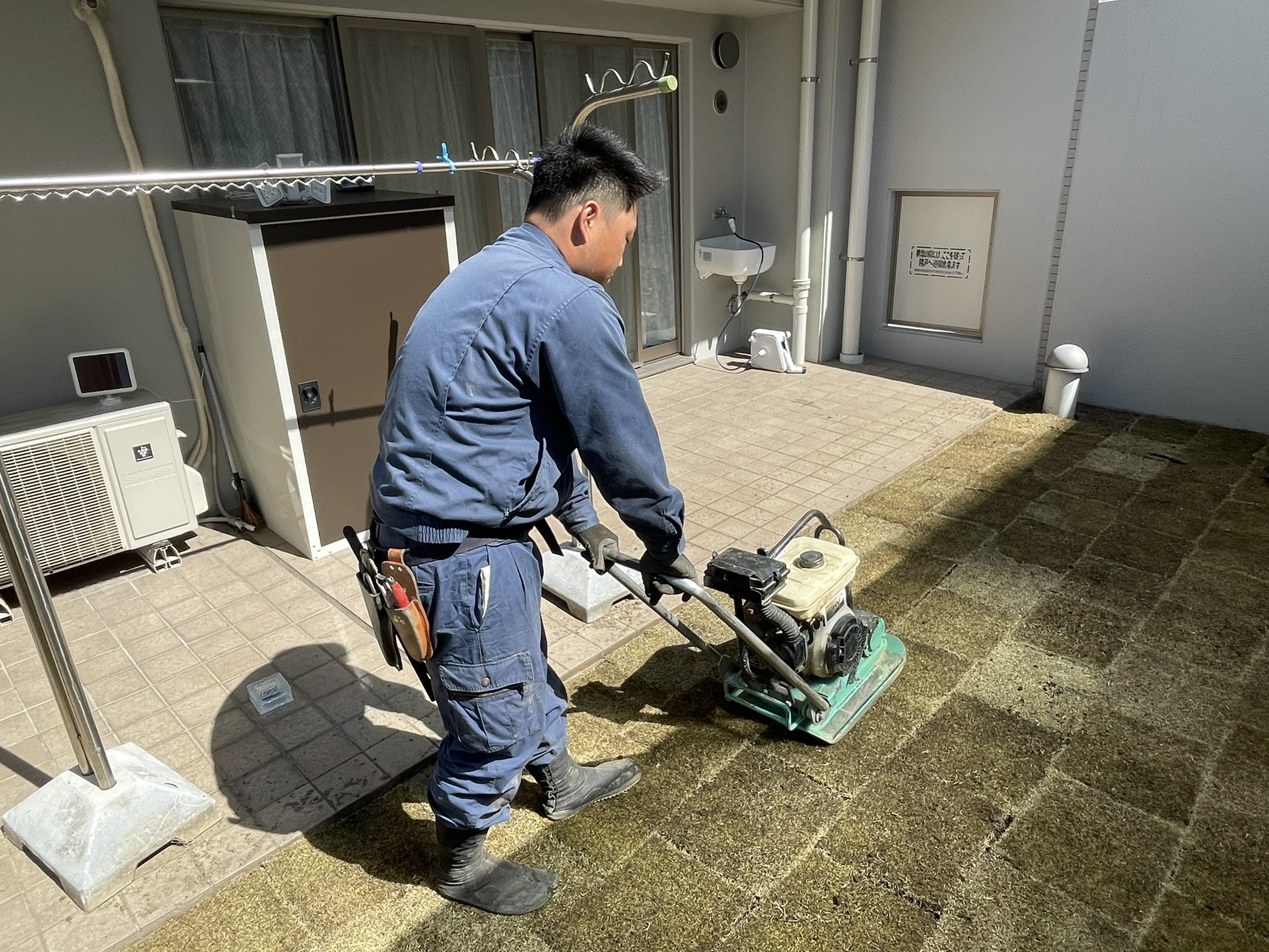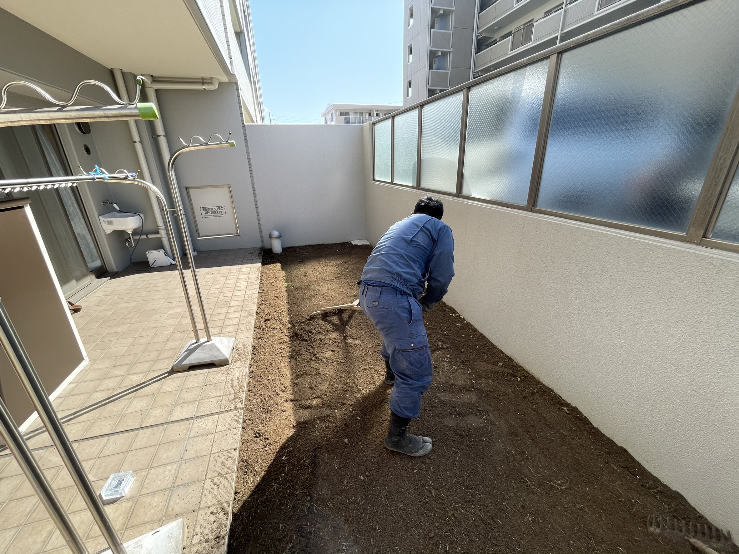既存の土の高さから芝生の厚さ分土をすき取り、よく転圧します。