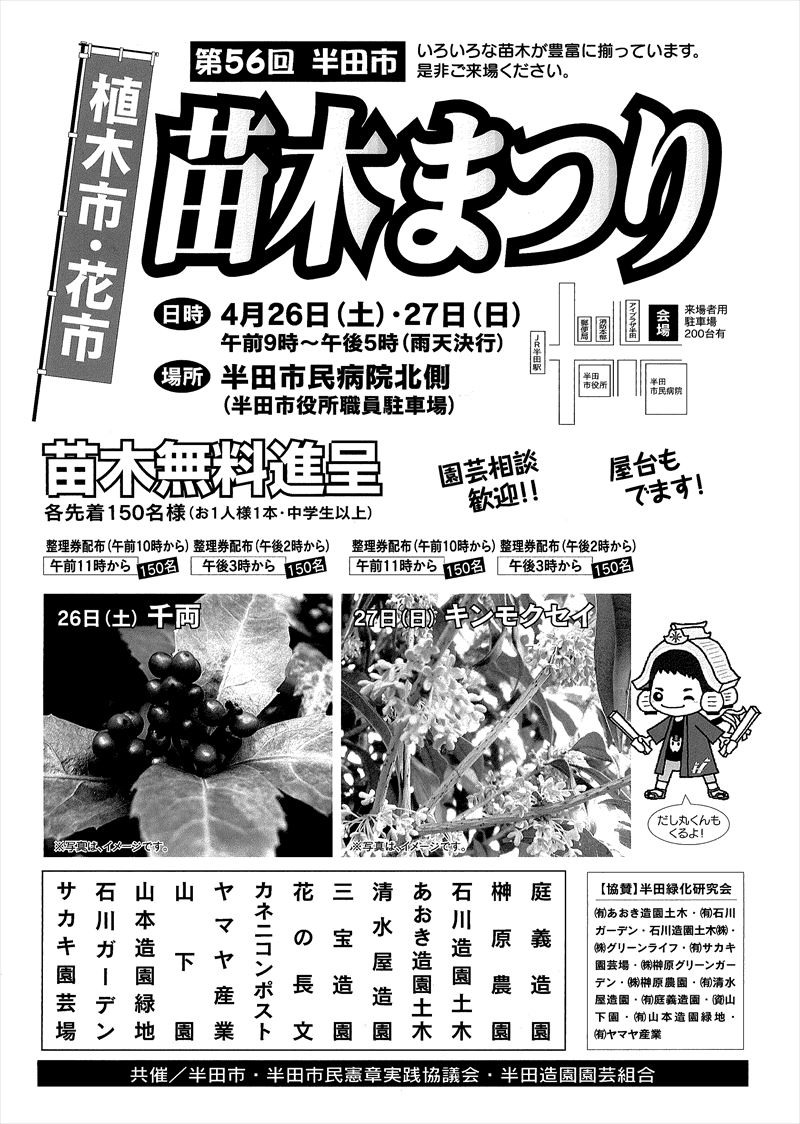 今年も恒例の苗木まつりが4月26日(土)27日(日)に開催されます。