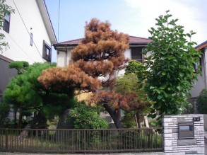 マツノザイセンチュウが増殖して水揚げが悪くなり、水分を必要とする夏に一気に枯れてしまう病気です。