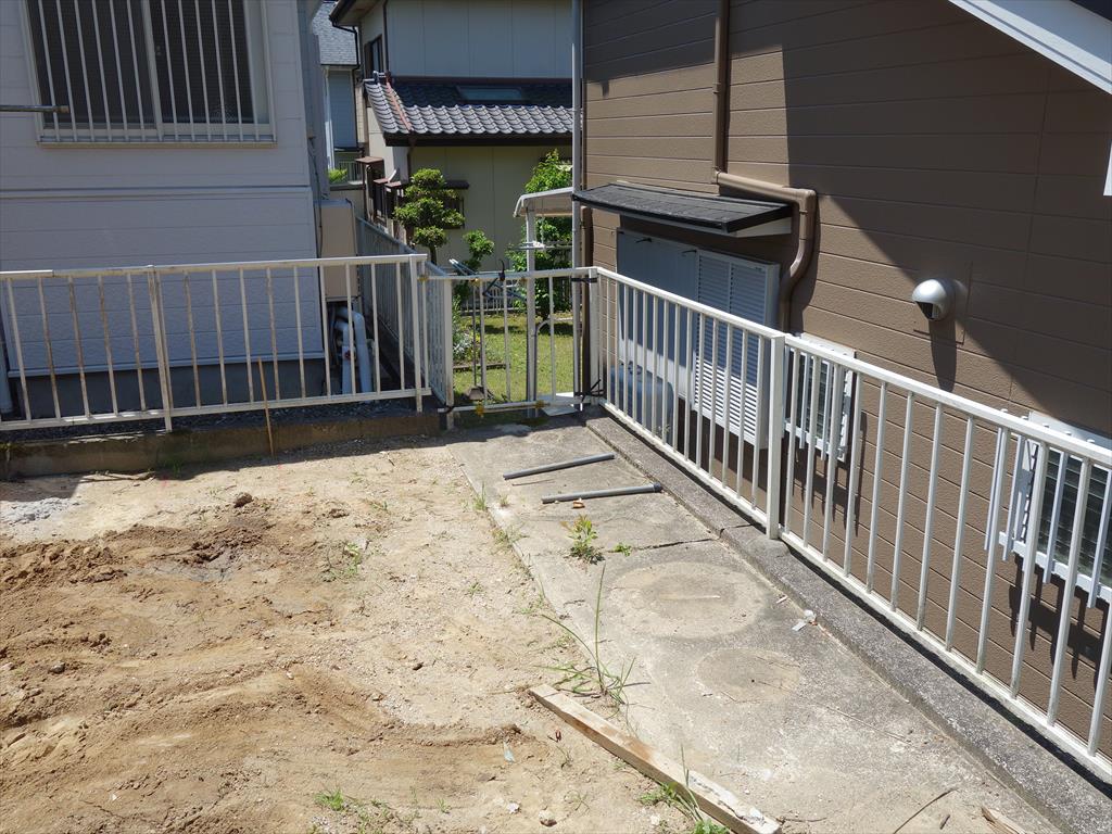 左官砂を引いて整地し、プレートで転圧してから、防草シートを張りました。